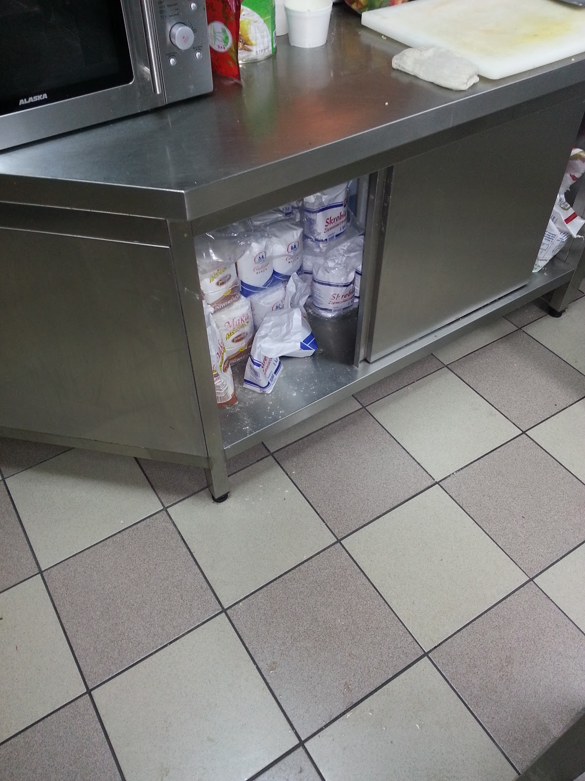 genero cocinado a la intemperie , sin estar en frio , mezclado con frutas , verduras ,etc....cajas que traen los proveedores , el cartón acumula suciedad y plagas de insectos (cucarachas,hormigas,etc.....)